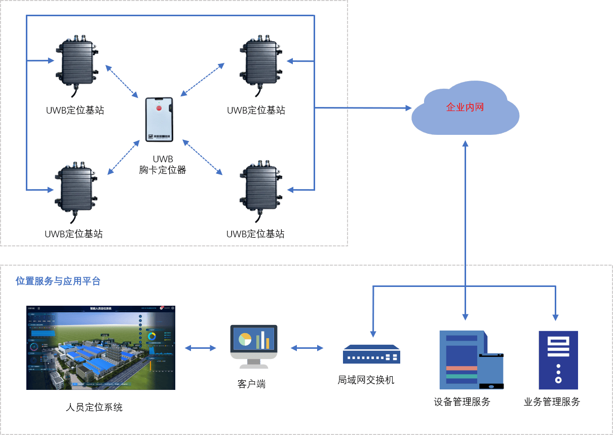 •核心管控区:在危化品存储区、高空作业区、关键设备操作区等需要厘米级定位的高风险区域,部署 UWB 基站,实现人员与设备的精准防撞、越界预警、一键报警等功能;