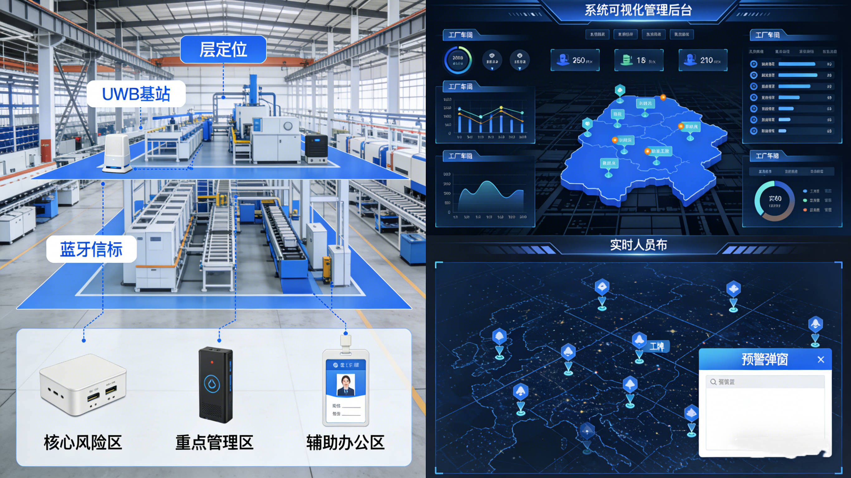 •辅助办公区:采用轻量化定位模块,仅满足人员基本在位状态监控,最大程度降低投入成本。